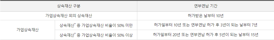 연간 분할납부기간은 상속인이 신청한 기간으로 하되, 다음 기간 내에 가능합니다.