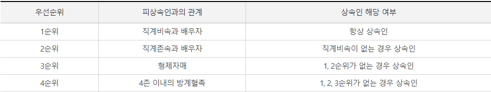 - 1순위 : 피상속인의 배우자, 자녀, 직계비속