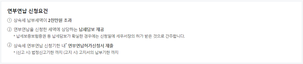 상속세 신고 시 납부해야 할 세액이나 세금계산서에 납부해야 할 세액이 2,000만 원을 넘으면 상속인 주소지 관할 세무서장의 허가를 받아 일정 기간 분할 납부할 수 있습니다.