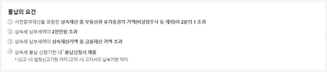 상속세는 한 번에 납부하는 것을 원칙으로 하되, 일시납부의 무거운 부담을 분산시켜 상속재산을 보호하고 납세의무를 쉽게 이행하기 위해서는 일정 요건을 충족하면 분할납부할 수 있습니다.