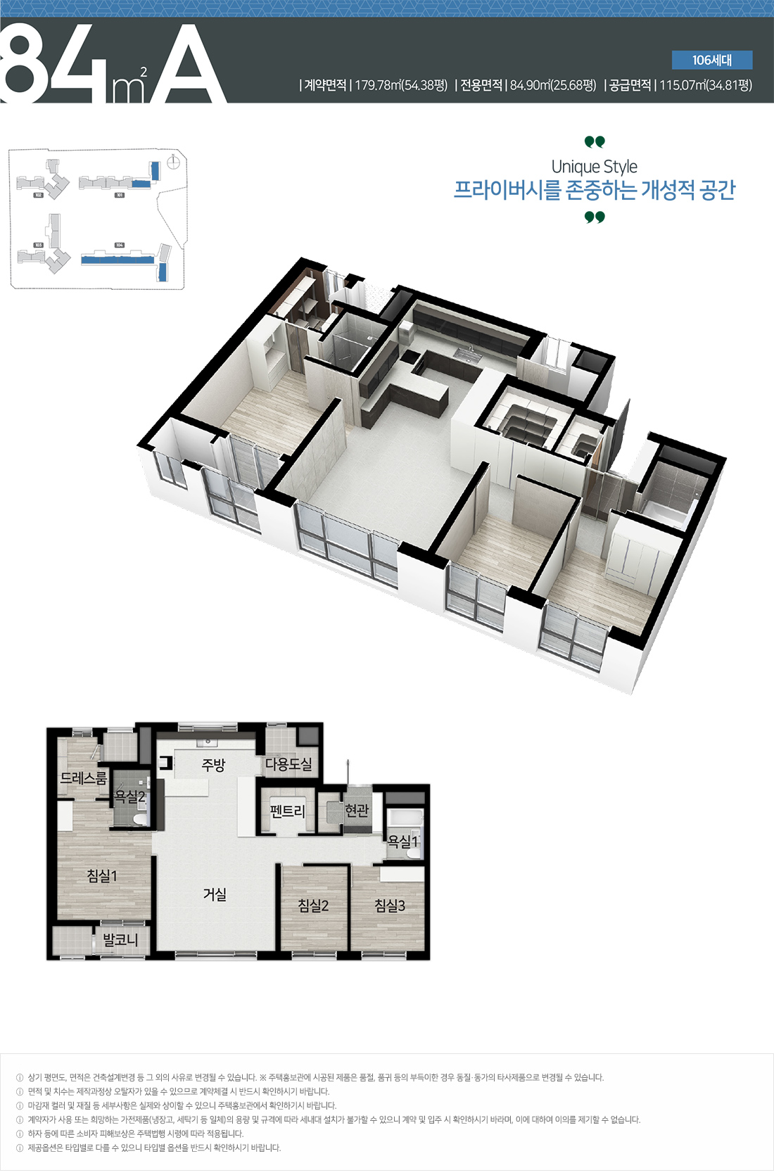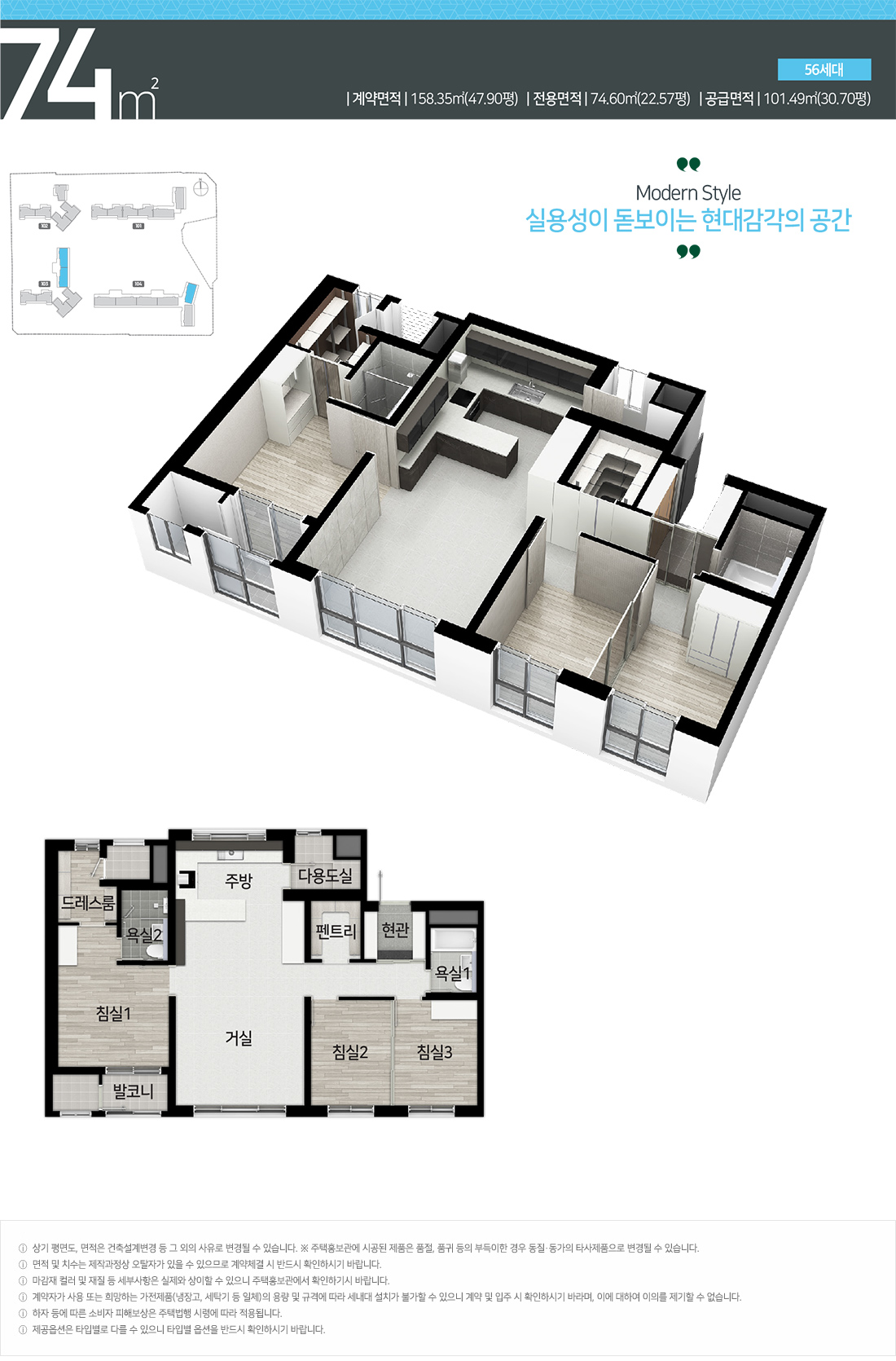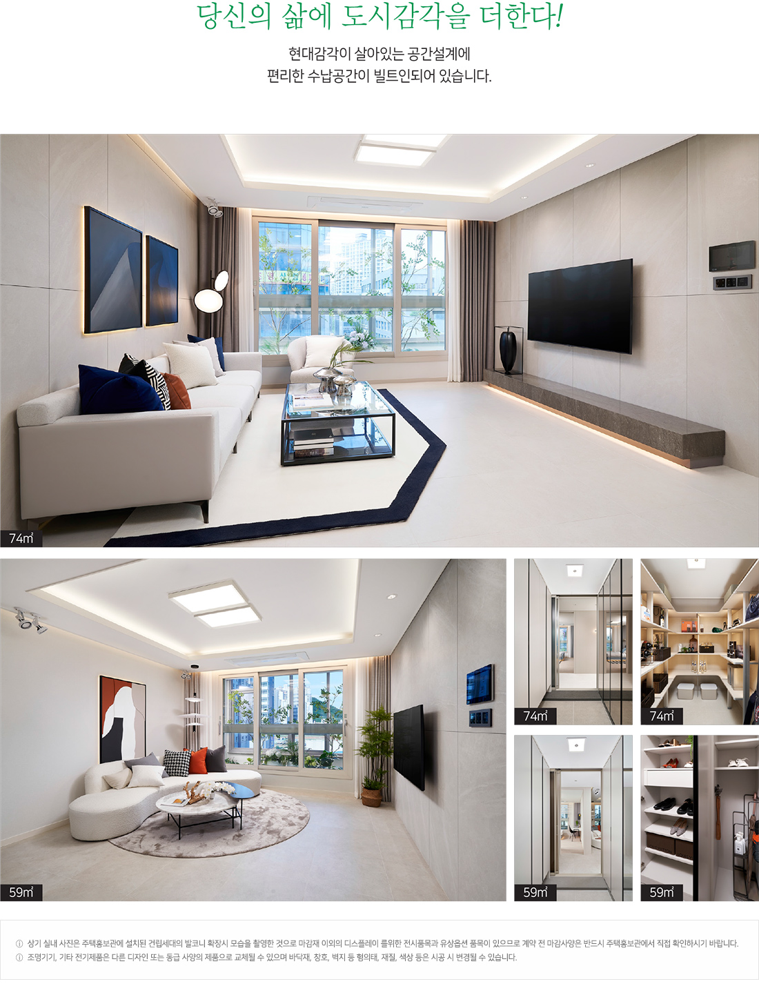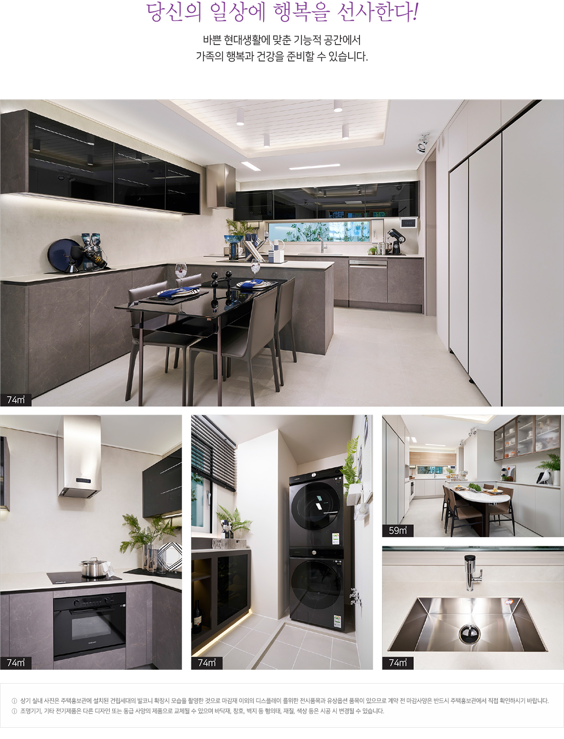 세분화된 구조로 시작하면 가장 작은 타입인 전용 59㎡는 거실과 주방을 중심으로 안방과 침실 2개를 갖추고 공간적 기능을 극대화할 수 있는 구성입니다.