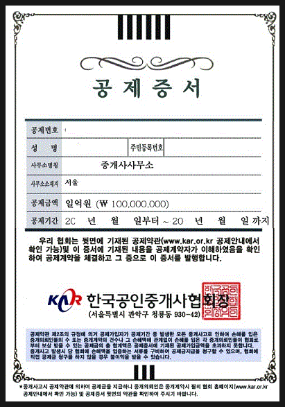부동산 공제증서는 부동산 거래 중 발생할 수 있는 사고에 대해 중개인이 일부 손해를 보상해야 하는 것을 방지하기 위해, 협회에서 보증하는 증서입니다. 중개인 대신 손해배상을 해주는 제도로, 중개인이 손해배상을 하지 못할 경우 대신 보상해줍니다. 중개인의 경우 현행법상 의무적으로 보험(공제)에 가입해야 하며, 가입한 금액에 따라 손해배상책임을 부담합니다. 부동산 공제증서의 경우, 발생한 사고에 대해 공인중개사가 보증 기간 동안 전체 혹은 일부 보상해주는 것이 일반적입니다.