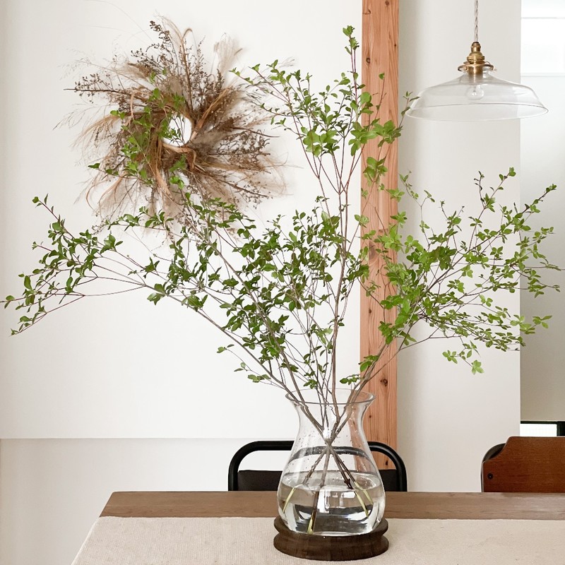 입이 벌어진 큰 플라워 베이스는, 큰 꽃다발을 그대로 살 수 있다. 가지는 대담하게 펼쳐지니까 공간이 있다면 꼭 시도해 봐. 빛의 오브제로도 추천! 플라워 베이스 안에 일루미네이션을 넣으면 빛 오브제 완성! 크리스마스 시즌은 물론, 밤의 방 연출에도 한몫합니다.