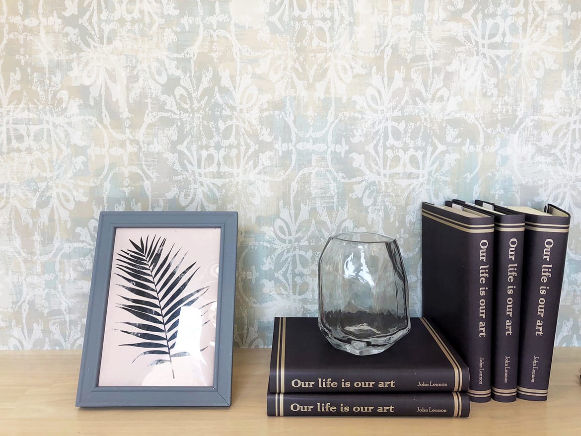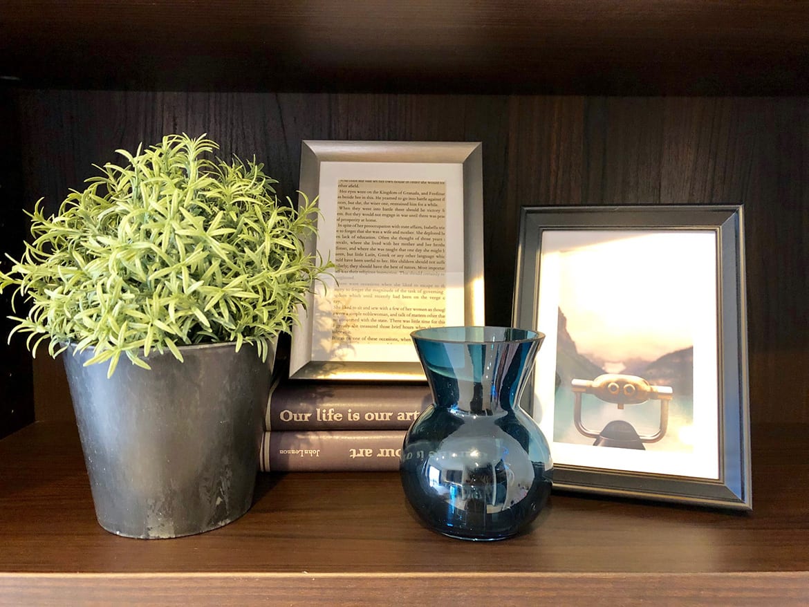 책이나 사전은 소품을 장식할 때 높낮이 차이를 내기에도 좋아요. 인테리어 소품을 세련되게 하는 하나의 방법으로 트라이앵글이라는 장식 방법이 있습니다. 트라이앵글을 의식해서 놓으면 균형이 잘 잡혀 멋져 보이므로, 책을 옆으로 놓고 높낮이 차이를 내 봅시다. 예를 들어 이런 가짜 식물이나 액자 등, 키가 별로 변하지 않는 것과 함께 꾸밀 때에도 책을 사용할 수 있습니다. 인테리어 소품을 여러 개 함께 꾸밀 때 높낮이 차를 내면 깊이가 있어 더 소품이 돋보입니다.