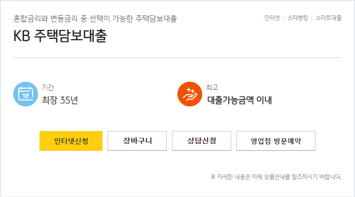 --> 혼합금리와 변동금리 중 선택이 가능한 주택담보대출 KB 주택담보대출 가입가능채널 인터넷 스타뱅킹 스마트대출 기간 최장 35년 대출한도 최고 대출가능금액 이내 ※ 자세한 내용은 아래 상
